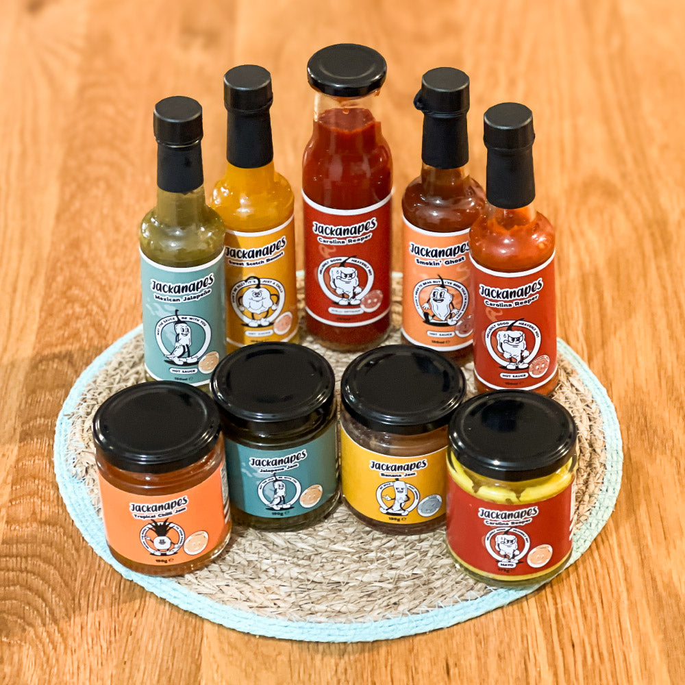 Indulge in Jackanapes' flavourful journey, a symphony for avid food enthusiasts. Indulge in our selection of Hot Sauces, Jams, Ketchup and Mayonnaise, the perfect companion to your favourite dish or snack.