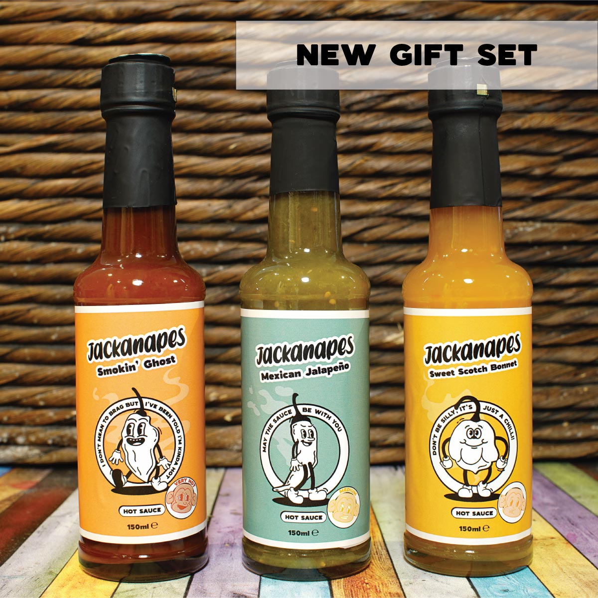 Hot Sauce Gift Pack by Jackanapes – 3 x 150ml Bottle Vegan Chilli Sauce Gift Set - Mild Mexican, Hot Sweet Scotch Bonnet and Very Hot Smokin’ Ghost